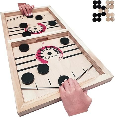 Get ready for an adrenaline rush with Sling Hockey, the incredibly fast-paced, addictive tabletop hockey game that’s taking game night by storm! Known also as the Fast Sling Puck Game, this wooden board game requires lightning speed, quick aim, and dexterity. It’s the ultimate test of reflexes for kids, teens, and adults!